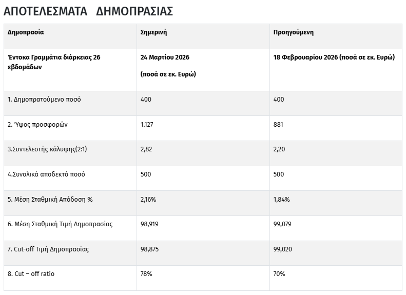 Η δημοπρασία πραγματοποιήθηκε μέσω των Βασικών Διαπραγματευτών Αγοράς (Primary Dealers), και η ημερομηνία διακανονισμού είναι η Παρασκευή 27 Μαρτίου 2026.