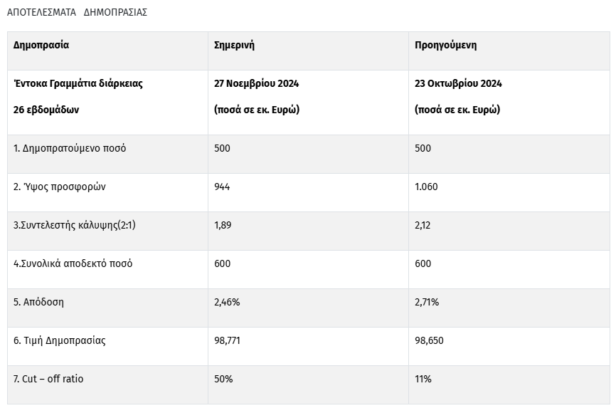 Η απόδοση «έπεσε» στο 2,46%, από 2,71% στην προηγούμενη δημοπρασία, που είχε πραγματοποιηθεί στις 23 Οκτωβρίου.