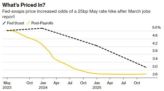 Περισσότερες πιθανότητες για μια νέα αύξηση αύξηση επιτοκίων τον Μάιο «βλέπουν» πλέον οι αγορές, μετά τη δημοσιοποίηση των στοιχείων για την αγορά εργασίας στις ΗΠΑ.
