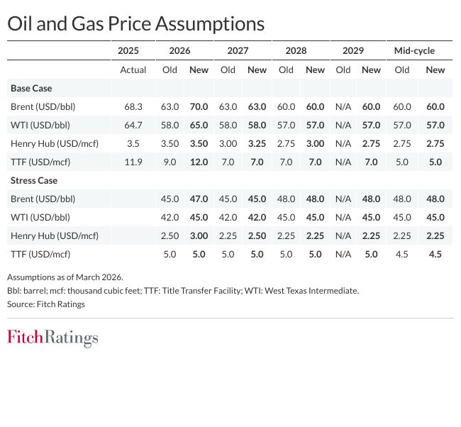 Παρόλα αυτά, η Fitch Ratings αναγνωρίζει τις διαταραχές που προκαλεί ο πόλεμος στη Μέση Ανατολή και αύξησε την εκτίμηση της για την τιμή του πετρελαίου μπρεντ για το 2026 στα 70 δολάρια ΗΠΑ/βαρέλι από 63 δολάρια ΗΠΑ/βαρέλι (αύξηση 11%), που ήταν η προηγούμενή της πρόβλεψη.