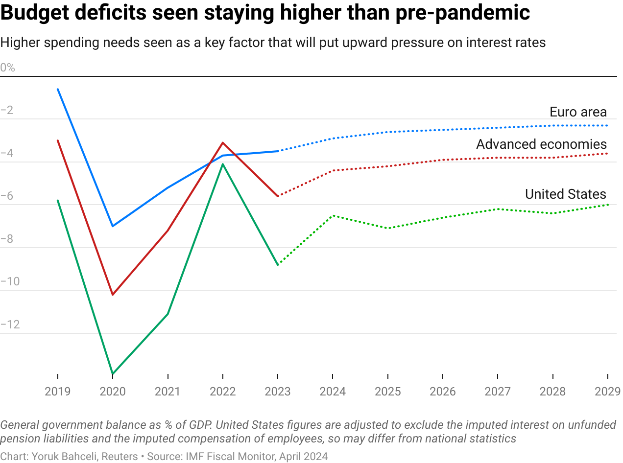 Τα δημοσιονομικά ελλείμματα των ανεπτυγμένων οικονομιών στο 5,6% της παραγωγής το 2023 ήταν σχεδόν διπλάσια από το 3% του 2019 και θα παραμείνουν αυξημένα στο 3,6% το 2029, όπως εκτιμά το ΔΝΤ.