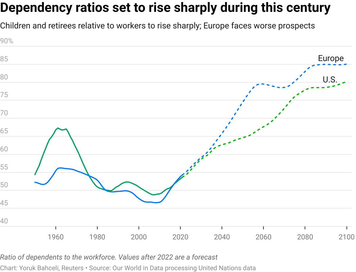 Αυτό μπορεί να συνεχιστεί, αφού το 16% του παγκόσμιου πληθυσμού θα είναι άνω των 65 ετών το 2050, από το 10% το 2022, σύμφωνα με τις προβλέψεις των Ηνωμένων Εθνών. Αλλά η αναλογία των εξαρτώμενων ατόμων, συμπεριλαμβανομένων των συνταξιούχων, προς τους εργαζόμενους αυξάνεται.