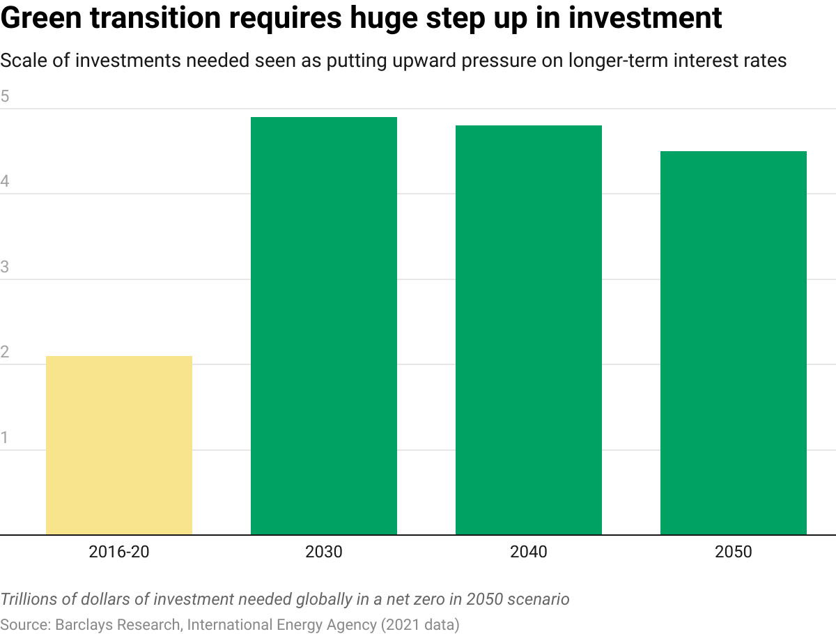 Η πράσινη μετάβαση απαιτεί τεράστιες επενδύσεις που θα μπορούσαν να αυξήσουν τα επιτόκια, όπως υποστηρίζει η Ιζαμπέλ Σνάμπελ της Ευρωπαϊκής Κεντρικής Τράπεζας συγκρίνοντας την κλίμακα με αυτή η οποία απαιτήθηκε για την ανοικοδόμηση της Ευρώπης μετά τον Β’ Παγκόσμιο Πόλεμο.