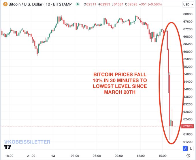 Από 73.750 δολάρια που ήταν η τιμή του bitcoin στις 24 Μαρτίου, όταν το κρυπτονόμισμα κατέγραψε ιστορικό υψηλό, κατέρρευσε στα 62.570 και, λίγο αργότερα, στα 60.908 δολάρια. Ανάλογη, ή χειρότερη για την ακρίβεια, είχαν και τα άλλα cryptos. Η τιμή του ethereum έπεσε κατά περισσότερο από 9% στα 2.923 δολάρια, καθώς οι τιμές για τα Binance coin και solana κατέρρευσαν κατά 9% και 18%, αντίστοιχα. Οι τιμές για αρκετά άλλα κρυπτονομίσματα έπεσαν κατά περισσότερο από 15%, με χαρακτηριστικότερα παραδείγματα τα avalanche (20%), XRP (20%) και το meme dogecoin (18%).