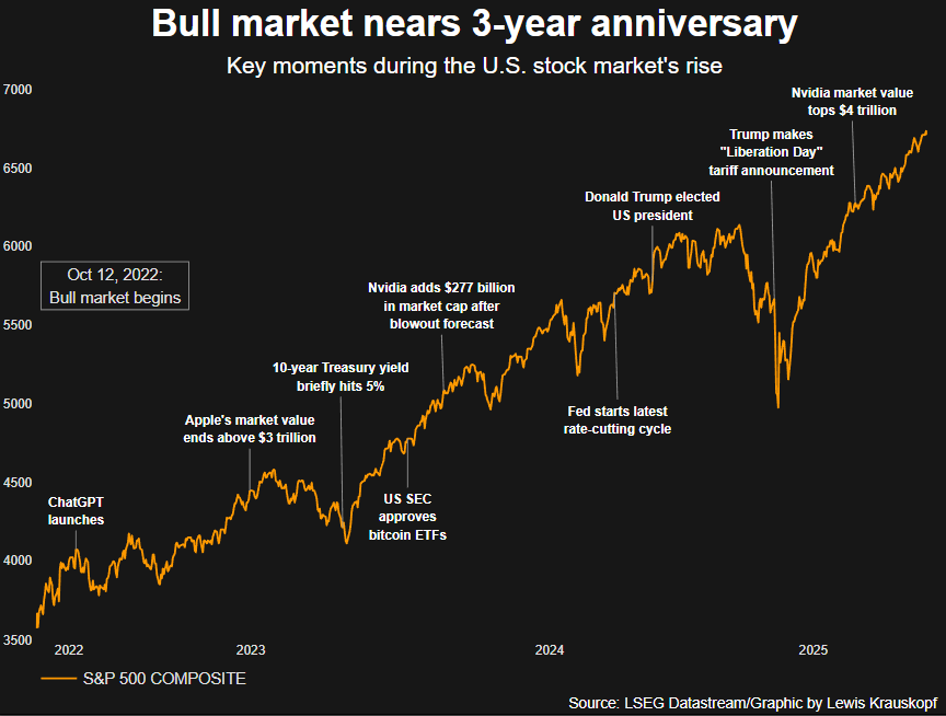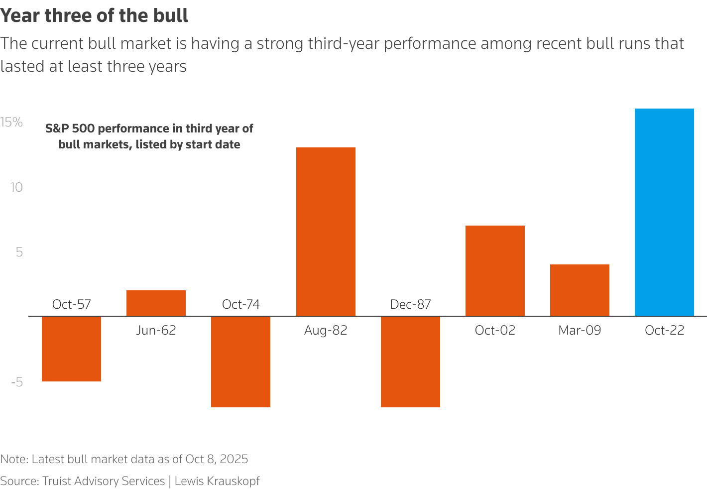 Ο S&P 500 έχει ανέβει περισσότερο από 15% από τον Οκτώβριο του 2024, το τρίτο έτος του τρέχοντος ράλι. Αυτή είναι η ισχυρότερη απόδοση του τρίτου έτους των bull markets από το 1957, με το τρίτο έτος να είναι συχνά μια περίοδος μικτών επιδόσεων κατά τη διάρκεια των bull runs, δήλωσε ο Κιθ Λέρνερ, διευθύνων σύμβουλος επενδύσεων της Truist Advisory Services.