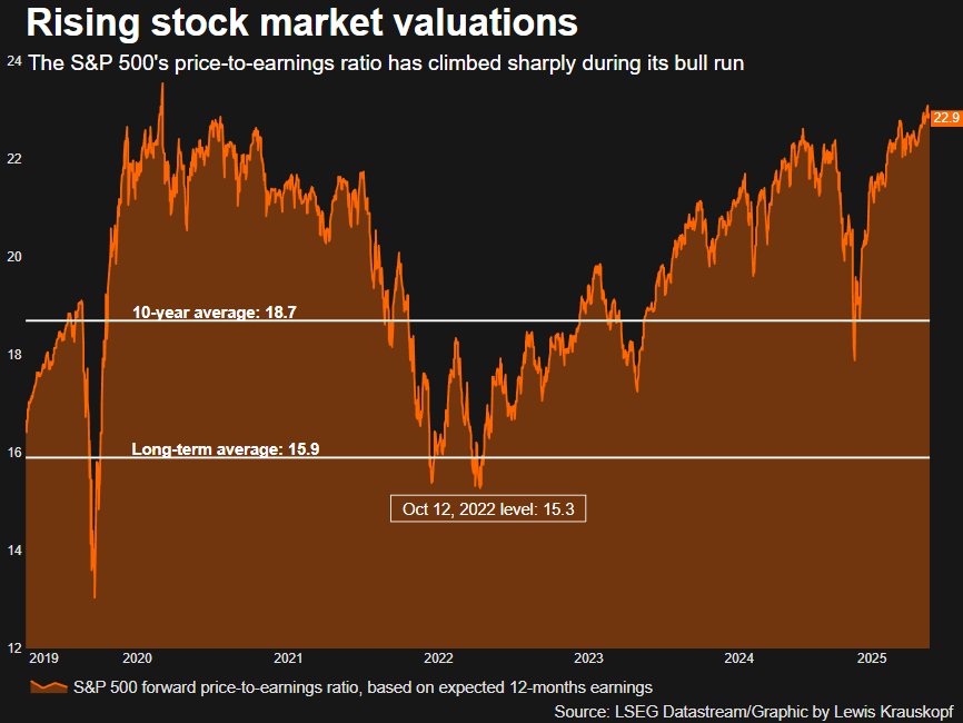 Η ανοδική πορεία αυτή έχει οδηγήσει και σε υψηλές αποτιμήσεις. Ο δείκτης τιμής προς κέρδη του S&P 500 έχει αυξηθεί σε επίπεδο 23x, περίπου στο υψηλότερο επίπεδό του τα τελευταία πέντε χρόνια και πολύ πάνω από τον μέσο όρο των 10 ετών που είναι 18,7, σύμφωνα με το LSEG Datastream. Αναφορικά, ο δείκτης P/E του δείκτη βρισκόταν στο 15,3 όταν έφτασε στο χαμηλό του κύκλου στις 12 Οκτωβρίου 2022.