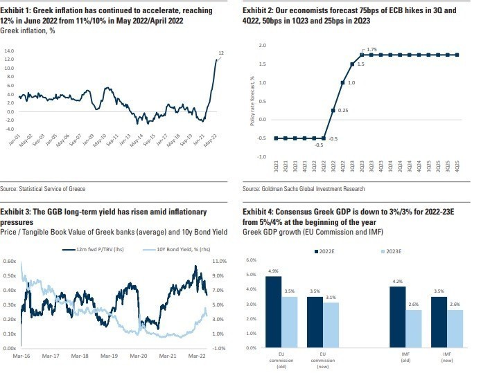Από την άλλη πλευρά, όμως, η επενδυτική τράπεζα αναγνωρίζει ότι «ο βαθμός μακροοικονομικής αβεβαιότητας αυξήθηκε τους τελευταίους τρεις μήνες », καθώς ο πληθωρισμός επιταχύνθηκε στο 12% τον Ιούνιο του 2022 (από 11%/10% τον Μάιο/Απρίλιο), ενώ οι εκτιμήσεις για το ΑΕΠ υποχώρησαν στο 3%/3% για το 2022/23 (από 4%-5%/3,5% στις αρχές του έτους). Το 10ετές ελληνικό ομόλογο δε, αντέδρασε σ’ αυτές τις μακροοικονομικές εξελίξεις, ανεβαίνοντας σε 3,5% – 4% τον Ιούλιο, παρότι το 2021 είχε καθοριστεί κατά μέσο όρο σε περίπου 1%.