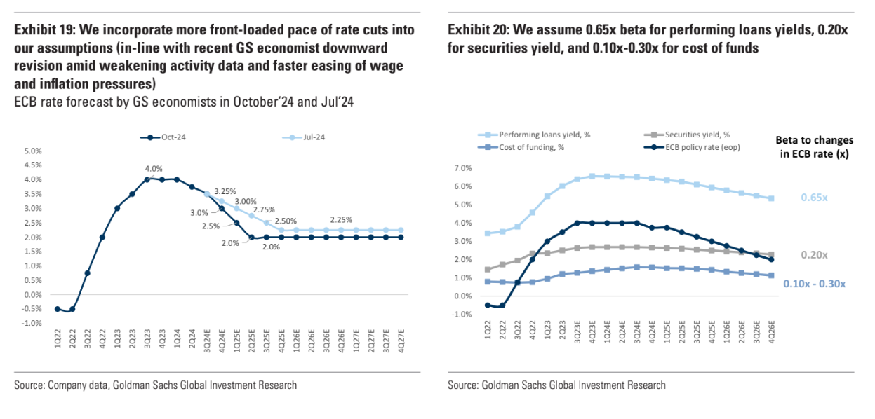 «Επικαιροποιούμε τις εκτιμήσεις μας ώστε να αντικατοπτρίζουν τα τελευταία στοιχεία της Τράπεζας της Ελλάδος, τις μακροοικονομικές προβλέψεις και τις τάσεις του κλάδου. Η σημαντικότερη αλλαγή που ενσωματώνεται με αυτή την επικαιροποίηση είναι ένας πιο γρήγορος ρυθμός μείωσης των επιτοκίων από ότι προηγουμένως. Οι οικονομολόγοι αναμένουν ότι το προσωπικό της ΕΚΤ θα μειώσει τις προβλέψεις για την ανάπτυξη και τον πληθωρισμό στη συνεδρίαση του Δεκεμβρίου, ανοίγοντας το δρόμο για περαιτέρω προσαρμογές κατά 25 μ.β. σε κάθε συνεδρίαση μέχρι το τελικό επιτόκιο του 2% τον Ιούνιο. Η πρόβλεψή μας υποδηλώνει τώρα ότι το 2024, 2025, 2026 τελικό ετήσιο επιτόκιο της ΕΚΤ θα είναι 3%, 2%, 2% έναντι της προηγούμενης υπόθεσής μας για 3,25%, 2,25%, 2,25%.