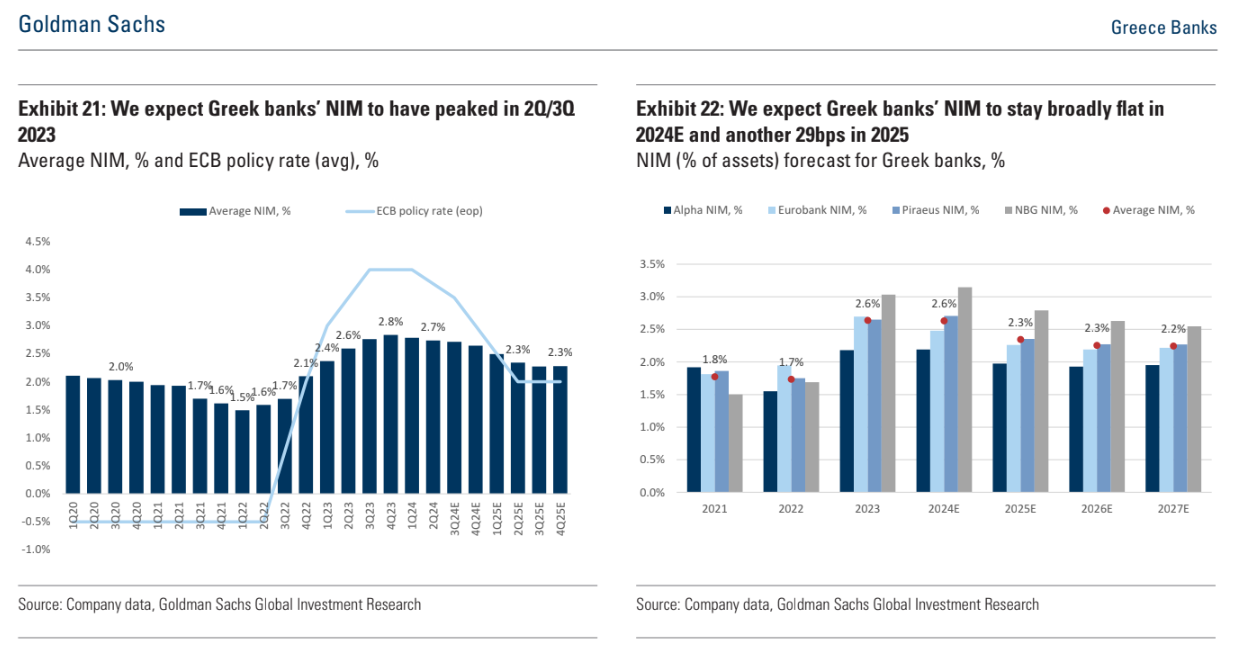 Η αναθεώρηση αυτή μεταφράζεται σε 0%/-5%/-2%/-1% μέση αναθεώρηση του καθαρού εσόδου από τόκους τα έτη 2024/2025/2026/2027 και 0%/-6%/-3%/-1% αναθεώρηση των κερδών ανά μετοχή (EPS) το 2024-2027. Ως αποτέλεσμα της αναθεώρησης των EPS σε αυτά τα έτη, οι τιμές-στόχοι μας για τις ελληνικές τράπεζες μειώνονται κατά 6% κατά μέσο όρο, με μείωση των τιμών στόχων 4%/5%/7%/8% για ΕΤΕ/Alpha/Eurobank/Πειραιώς, αντίστοιχα).
