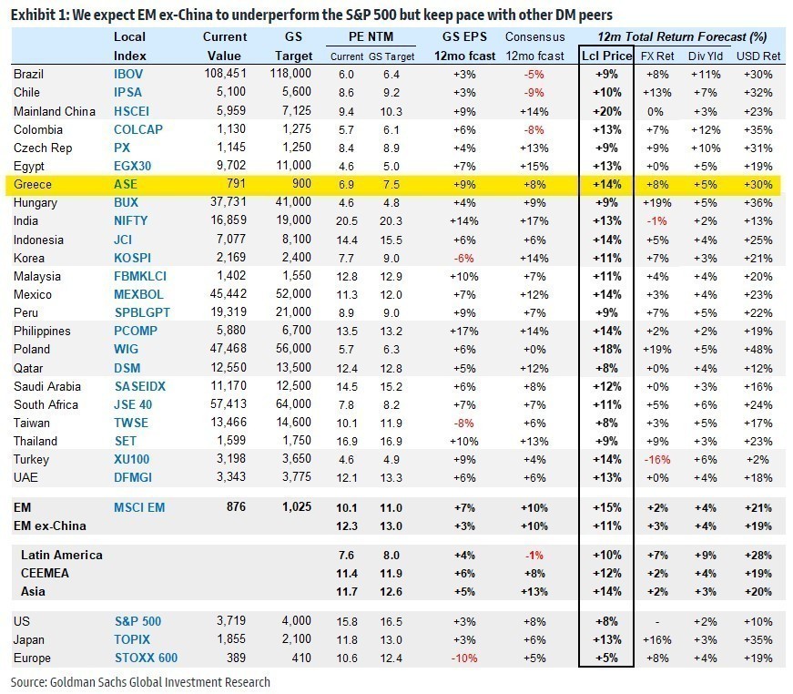 «Συνιστούμε να παραμείνουμε «υποεπενδεδυμένοι» στις αναδυόμενες αγορές έναντι των ΗΠΑ βραχυπρόθεσμα και τονίζουμε ότι οι αγορές της Ασίας (εκτός Ινδίας) είναι πιο ελκυστικές από άποψη αποτίμησης, ιδίως σε σχέση με τη Λατινική Αμερική. Η βραχυπρόθεσμη υπερεπενδεδυμένη θέση μας στη Λατινική Αμερική οφείλεται στη σχετική απομόνωση των χωρών από τους κινδύνους ανάπτυξης στις ανεπτυγμένες αγορές», συμπεραίνει η Goldman Sachs.