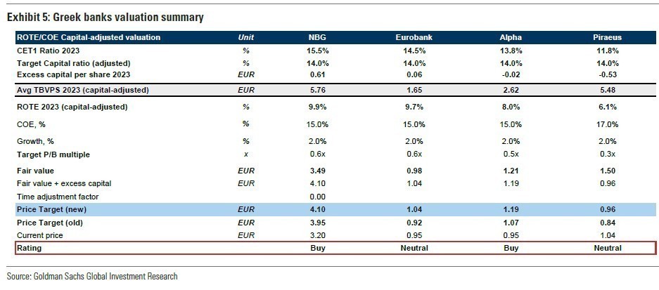 Η Goldman Sachs θέτει νέες υψηλότερες τιμές στόχους για τις τέσσερις συστημικές τράπεζας με την Εθνική Τράπεζα στα 4,10 ευρώ (από 3,95 ευρώ), την Τράπεζα Πειραιώς στα 0,96 ευρώ (από 0,84 ευρώ), την Alpha Bank στα 1,19 ευρώ (από 1,07 ευρώ) και τέλος τη Eurobank στα 1,04 ευρώ (από 0,92 ευρώ). Οι συστάσεις είναι buy ή αγορά για την Εθνική Τράπεζα και την Alpha Bank και neutral ή ουδέτερη σύσταση για τις Eurobank και Τράπεζα Πειραιώς.