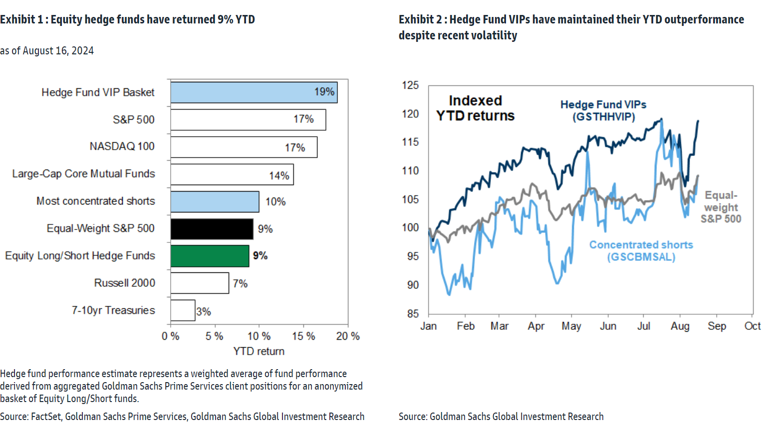 Επιδόσεις: Τα hedge funds που επενδύουν σε μετοχές των ΗΠΑ (long/short) έχουν επιτύχει σταθερή απόδοση +9% φέτος παρά την πρόσφατη μεταβλητότητα της αγοράς. Οι ισχυρές επιδόσεις των δημοφιλών long θέσεων των hedge funds έχουν στηρίξει τις αποδόσεις. Ο κατάλογος Hedge Fund VIP των πιο δημοφιλών θέσεων long έχει αποδώσει +19% φέτος, παρά το sell-off 10% τον Ιούλιο, ξεπερνώντας τον ισοσταθμισμένο δείκτη S&P 500 (+9%). Τα δημοφιλή longs έχουν υπεραποδώσει έναντι των συγκεντρωμένων shorts φέτος σε όλους τους τομείς, εκτός από τους τομείς των καταναλωτικών αγαθών και των τηλεπικοινωνιών.