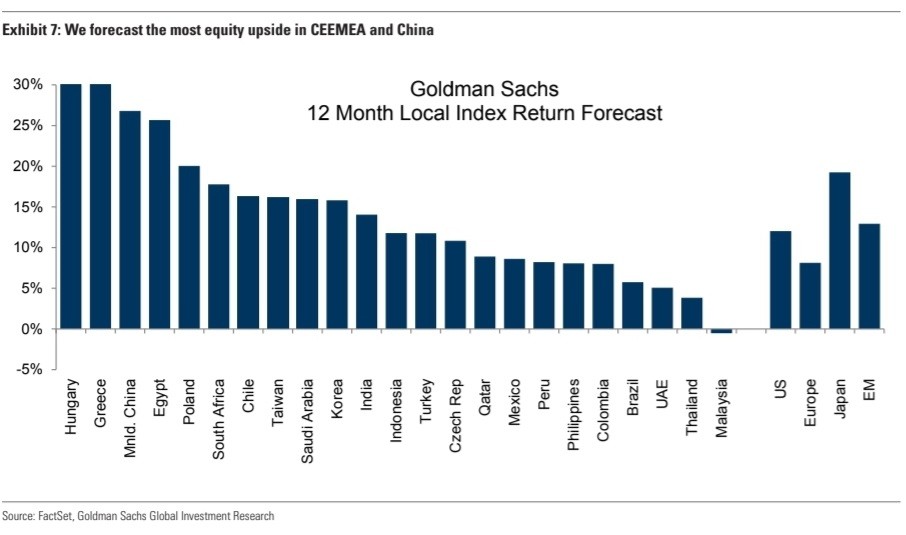 Νέα αυξημένη σημαντικά τιμή-στόχο για την Ελλάδα από την επενδυτική τράπεζα Goldman Sachs για την εγχώρια αγορά και τον Γενικό Δείκτη. Ο αμερικανικός επενδυτικός οίκος θέτει ως στόχο για τον Γενικό Δείκτη του Χρηματιστηρίου στις 1.175 μονάδες από τις 950 μονάδες που ανέμενε τον Δεκέμβριο του 2021, με το περιθώριο ανόδου να ξεπερνά το 30% και είναι το δεύτερο υψηλότερο ανάμεσα στις αναδυόμενες αγορές που αναφέρει στο report. Η μεση εκτίμηση των αναλυτών για την τιμή στόχο του βασικού χρηματιστηριακού δείκτη είναι στις 1.188 μονάδες.
