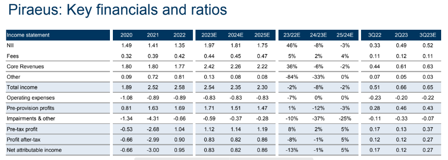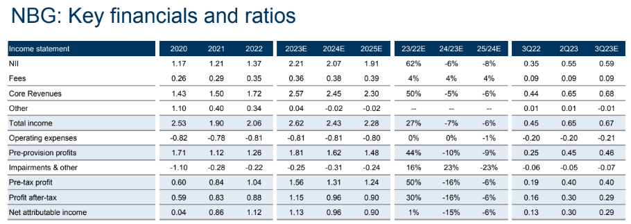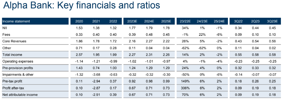 Με αφορμή τις ανακοινώσεις των τριμηνιαίων αποτελεσμάτων τρίτου τριμήνου, η GS εκτιμά ότι οι ελληνικές τράπεζες θα συνεχίσουν να επωφελούνται από τα αυξημένα επιτόκια της ΕΚΤ, καθώς η κεντρική τράπεζα αύξησε τα επιτόκια 50 μονάδες βάσης σε σχέση με το προηγούμενο τρίμηνο. Η αύξηση στα καθαρά έσοδα από τόκους (NII) θα είναι της τάξεως του 5% σε σχέση με το δεύτερο τρίμηνο. Αρωγοί στην αύξηση θα είναι ο συνδυασμός υψηλής μετακύλισης των αυξήσεων των επιτοκίων στις αποδόσεις των δανείων και οι σταθερές καταθέσεις στο τρίτο τρίμηνο, καθώς το μερίδιο των προθεσμιακών καταθέσεων παρέμεινε σε γενικές γραμμές αμετάβλητο σε 23% περίπου κατά τη διάρκεια του τριμήνου, σύμφωνα και με τα στοιχεία της Τράπεζας της Ελλάδος.