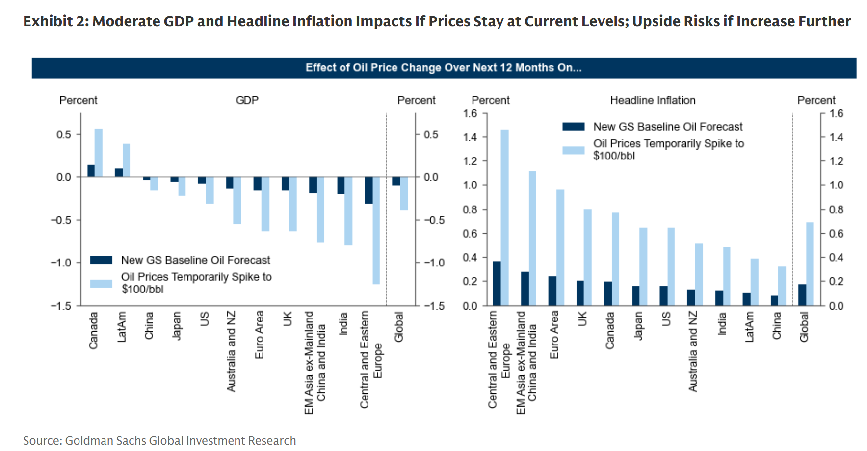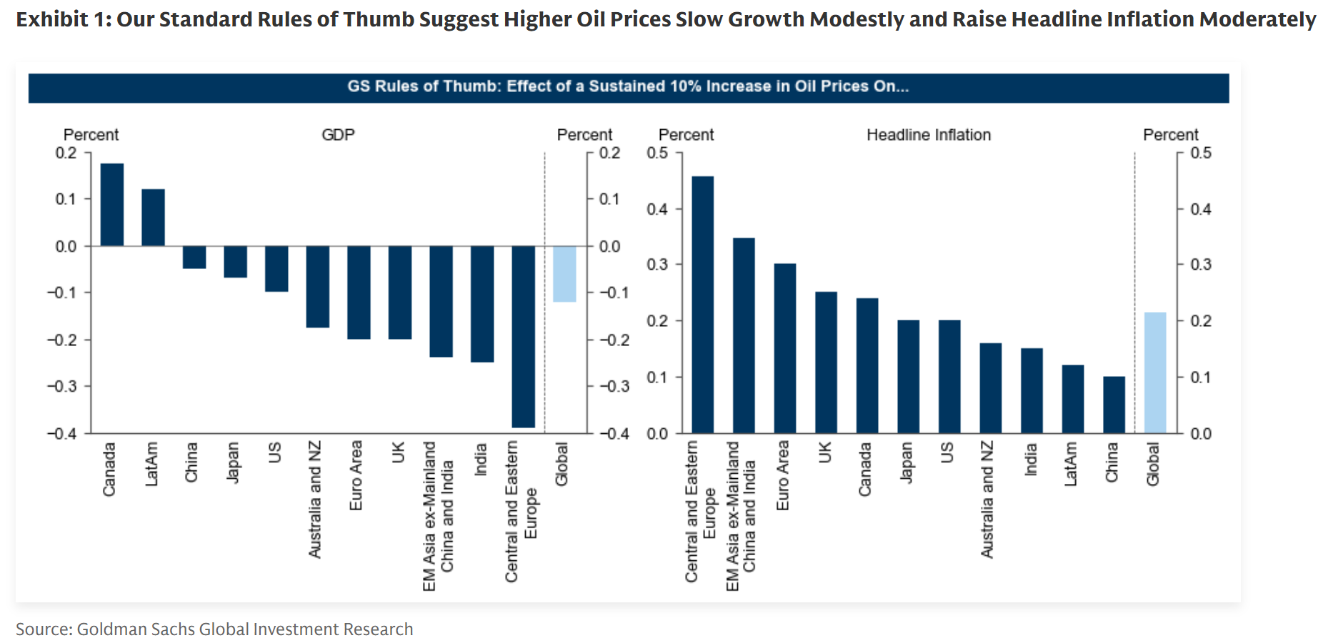 Οι οικονομολόγοι Joseph Briggs, Megan Peters και Sarah Dong εκτιμούν ότι μια σταθεροποίηση της τιμής του πετρελαίου κοντά στα 80 δολάρια το βαρέλι, περίπου 14% υψηλότερα σε σχέση με τα επίπεδα στα τέλη Φεβρουαρίου, θα έχει περιορισμένη αλλά σαφή επίδραση στο παγκόσμιο μακροοικονομικό περιβάλλον. Με βάση τα υποδείγματα της τράπεζας, αυτή η μεταβολή θα μπορούσε να αυξήσει τον παγκόσμιο πληθωρισμό κατά περίπου 0,2 ποσοστιαίες μονάδες και να μειώσει τον ρυθμό ανάπτυξης κατά περίπου 0,1 ποσοστιαία μονάδα.