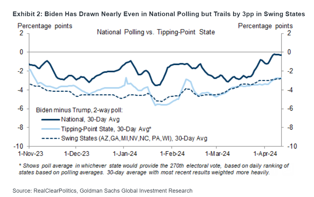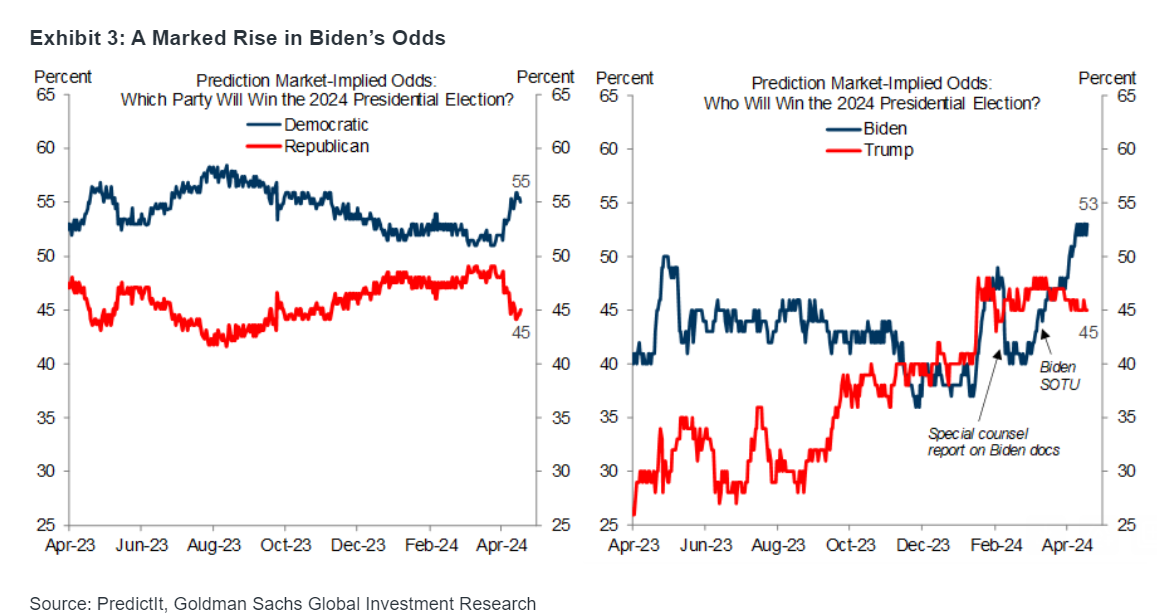 Αναφορικά με το τι έχει αλλάξει, ο οίκος εξηγεί ότι το προβάδισμα του Μπάιντεν έναντι του Τραμπ σε ορισμένες αγορές προβλέψεων είναι τώρα το μεγαλύτερο από τον Νοέμβριο του 2023, αν και η δημοτικότητά του έχει κινηθεί πλαγιο-καθοδικά τις τελευταίες δύο εβδομάδες στο 39% περίπου, ελαφρώς πάνω από το χαμηλό 37% του περασμένου μήνα και κάτω από τον μέσο όρο της δημοτικότητας του Τραμπ έξι μήνες πριν χάσει τις εκλογές του 2020.