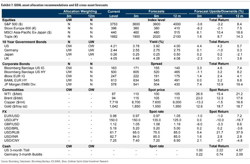 Ο χρυσός είναι μαζί με το πετρέλαιο οι πλέον θετικές συστάσεις της αμερικανικής επενδυτικής τράπεζας, καθώς τα περιθώρια ανόδου είναι πολύ υψηλά. Ειδικά για το πετρέλαιο, η Goldman Sachs, προσδοκά “άλμα” κυριολεκτικά στην τιμή του το επόμενο τρίμηνο, αφού προβλέπει ότι από τα 94 δολάρια το βαρέλι θα «εκτοξευτεί» στα 115 δολάρια ή 26,9% υψηλότερα προτού κινηθεί στα 100 δολάρια σε έξι μήνες και στα 105 δολάρια σε δώδεκα μήνες από σήμερα. Για το «κίτρινο» μέταλλο, το περιθώριο ανόδου το επόμενο δωδεκάμηνο είναι 19% με την τιμή-στόχο στα 1.950 δολάρια δολάρια η ουγκιά από 1.642 δολάρια που είναι η τρέχουσα τιμή.