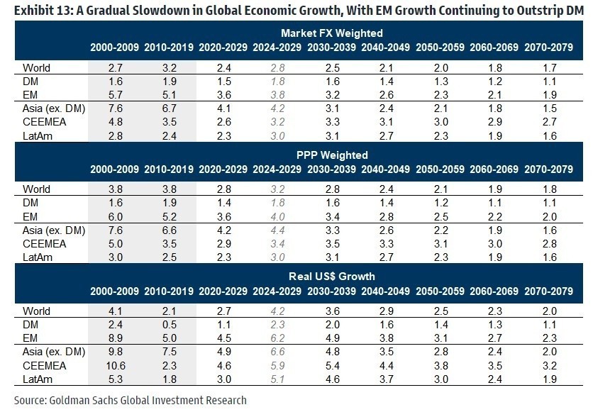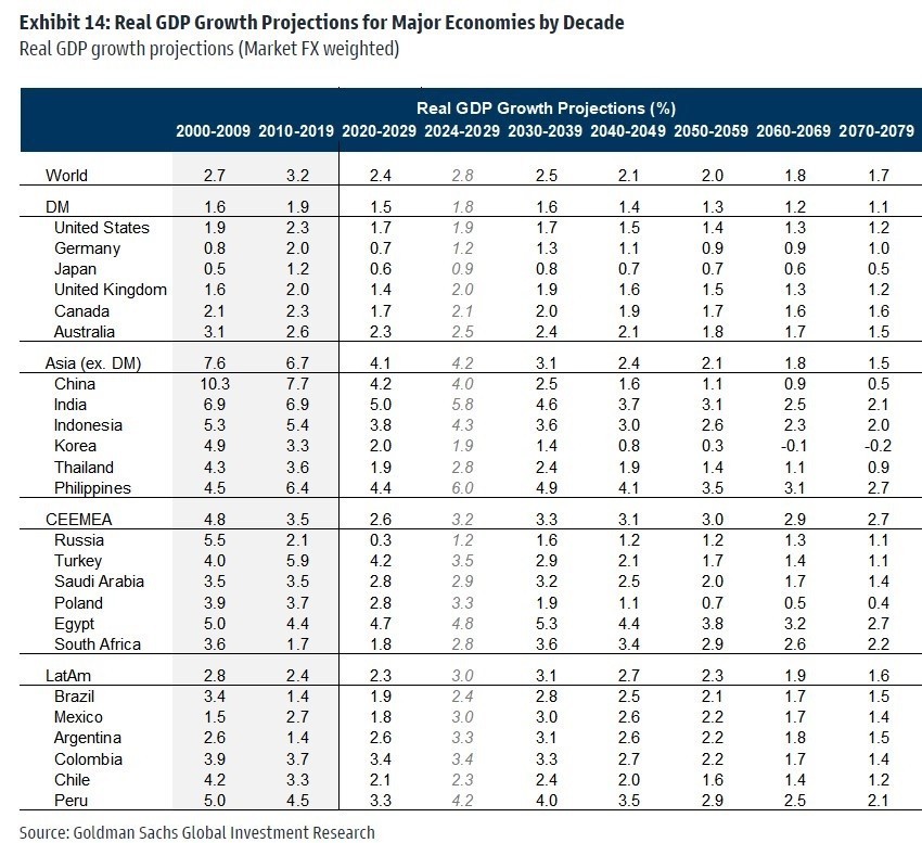 Οι προβλέψεις της αμερικανικής επενδυτικής τράπεζας υποδηλώνουν ότι η Κίνα, οι Ηνωμένες Πολιτείες, η Ινδία, η Ινδονησία και η Γερμανία θα είναι οι πέντε μεγαλύτερες οικονομίες του κόσμου το 2035, με την Κίνα να παίρνει τα ηνία από τις ΗΠΑ το 2050 και την Ινδία να ξεπερνά τις ΗΠΑ το 2075, ρίχνοντας την υπερδύναμη στην τρίτη θέση.