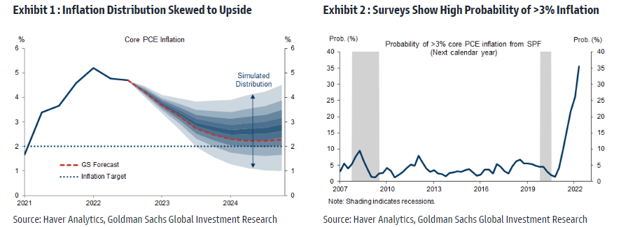 Οι προσδοκίες των οικονομολόγων, σύμφωνα με τις έρευνες για τον πληθωρισμό στις ΗΠΑ, δείχνουν κινδύνους για υψηλότερα επίπεδα, εξηγεί η Goldman Sachs. «Επομένως, χωρίς ύφεση, οι μέσες προσδοκίες για το επιτόκιο των ομοσπονδιακών κεφαλαίων της Fed θα πρέπει αναμφισβήτητα να είναι ελαφρώς υψηλότερες από την τρέχουσα τιμολόγηση της αγοράς και τις δικές μας προβλέψεις το 2023-2024, με βάση το πλαίσιο του κανόνα Taylor και χωρίς να λαμβάνονται υπόψη τυχόν υπερβολικές αλλαγές στις χρηματοπιστωτικές συνθήκες», εξηγούν οι οικονομολόγοι της τράπεζας Pandl και Tessari. Με άλλα λόγια, εάν η αμερικανική οικονομία αποφύγει την ύφεση, οι μέσες προσδοκίες για τα επιτόκια μπορεί να κινηθούν σε υψηλότερα επίπεδα από τις συνήθεις προβλέψεις της τράπεζας και τις τρέχουσες τιμές της αγοράς, υπό το φως των ανοδικών κινδύνων για τον πληθωρισμό.