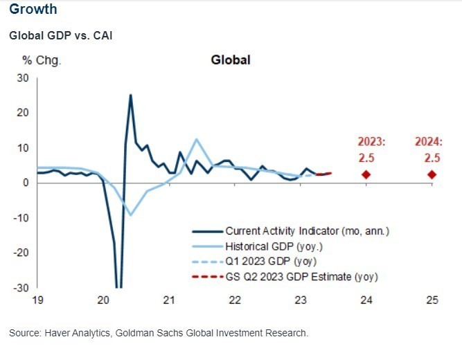 Σε παγκόσμιο επίπεδο, η αμερικανική τράπεζα Goldman Sachs αναμένει ότι ο μέσος ετήσιος ρυθμός αύξησης του πραγματικού ΑΕΠ θα επιβραδυνθεί στο 2,5% σε ετήσια βάση φέτος, αντανακλώντας τις συνεχιζόμενες επιβαρύνσεις από τη σύσφιγξη της νομισματικής πολιτικής και τον αυστηρότερο τραπεζικό δανεισμό σε ΗΠΑ και Ευρώπη, αλλά και την ηπιότερη ανάπτυξη της Κίνας.