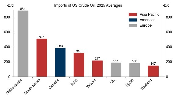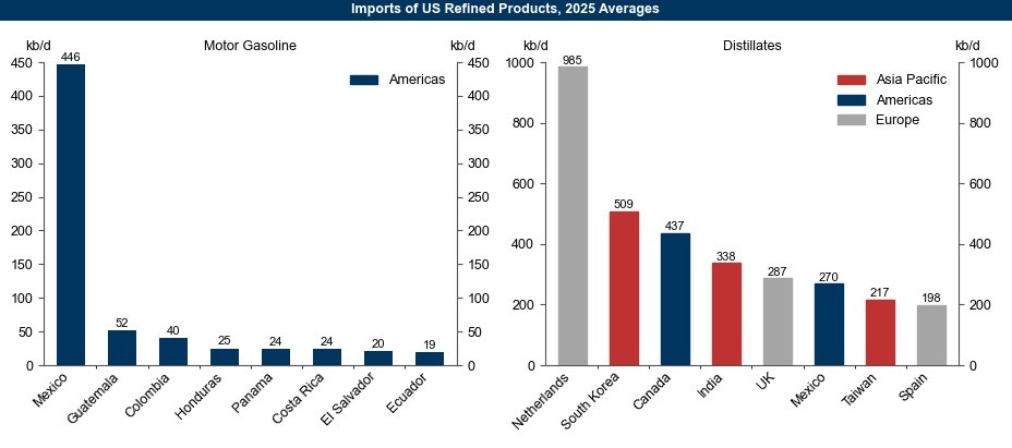 Αν και δεν αποτελεί το βασικό σενάριο, μια υποθετική απαγόρευση εξαγωγών θα μείωνε σημαντικά την προσφορά αργού στη Βορειοδυτική Ευρώπη και τη Νότια Κορέα, καθώς και τη διαθεσιμότητα ντίζελ και βενζίνης στο Μεξικό, τη Βορειοδυτική Ευρώπη και τη Νότια Κορέα.