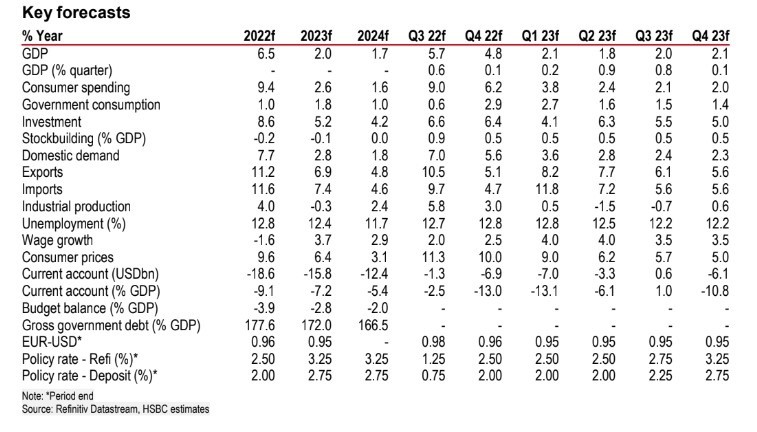 Η βρετανική τράπεζα HSBC διατηρεί την πρόβλεψή της για το ΑΕΠ στο 6,5% φέτος, αλλά έχει μειώσει την πρόβλεψη για το 2023 στο 2% από 2,5% και αναμένει ανάπτυξη 1,7% το 2024, χάρη στη στήριξη του πακέτου της ΕΕ NGEU, από τo οποίο η Ελλάδα θα μπορούσε να λάβει 31 δισ. ευρώ έως το 2026, και το οποίο θα πρέπει να στηρίξει τόσο τις δημόσιες όσο και τις ιδιωτικές επενδύσεις. O δείκτης τιμών καταναλωτή στο τέλος του έτους θα είναι της τάξεως 10% φέτος και στο 4% στο τέλος του 2023.