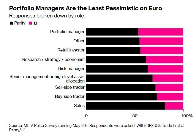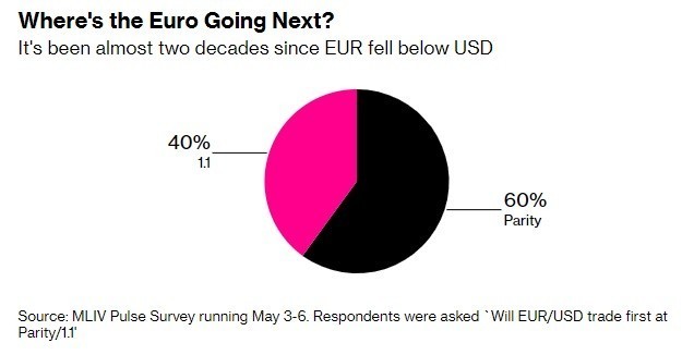 Πρόσφατη έρευνα της MLIV, η οποία δημοσιεύεται στο πρακτορείο Bloomberg, δείχνει ότι το 60% των αναλυτών θεωρεί ότι το ευρώ θα υποχωρήσει πράγματι στο 1 δολάριο, ενώ μόνο το 40% «ποντάρει» στην πιθανότητα το ευρωπαϊκό νόμισμα να ανακάμψει στο 1,15 δολάριο.