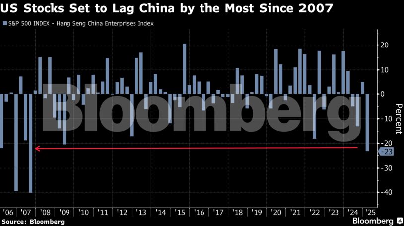 Αντίθετα, στην Κίνα, οι μετοχές βρίσκονται σε διαρκή άνοδο το 2025. Ένας δείκτης κινεζικών μετοχών στο Χονγκ Κονγκ έχει αυξηθεί κατά 20%, ξεπερνώντας κατά πολύ την απόδοση του S&P 500 και σηματοδοτώντας τη μεγαλύτερη απόκλιση από το 2007.
