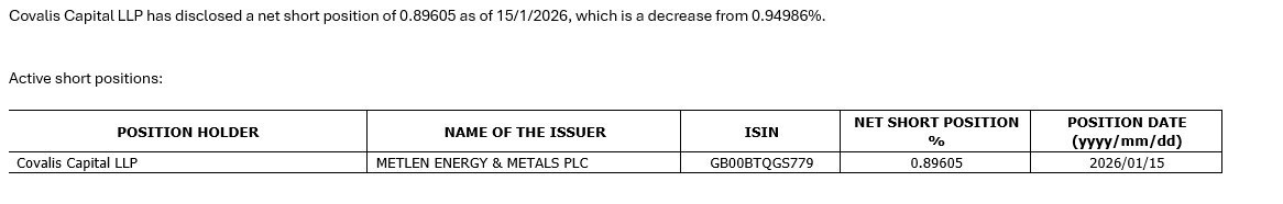 Ειδικότερα, η Covalis Capital LLP ανακοίνωσε πως μείωσε την καθαρή αρνητική θέση της (net short position) σε 0,89605% στις 15 Ιανουαρίου 2026, που αποτελεί υποχώρηση από το 0,94986% προηγουμένως.