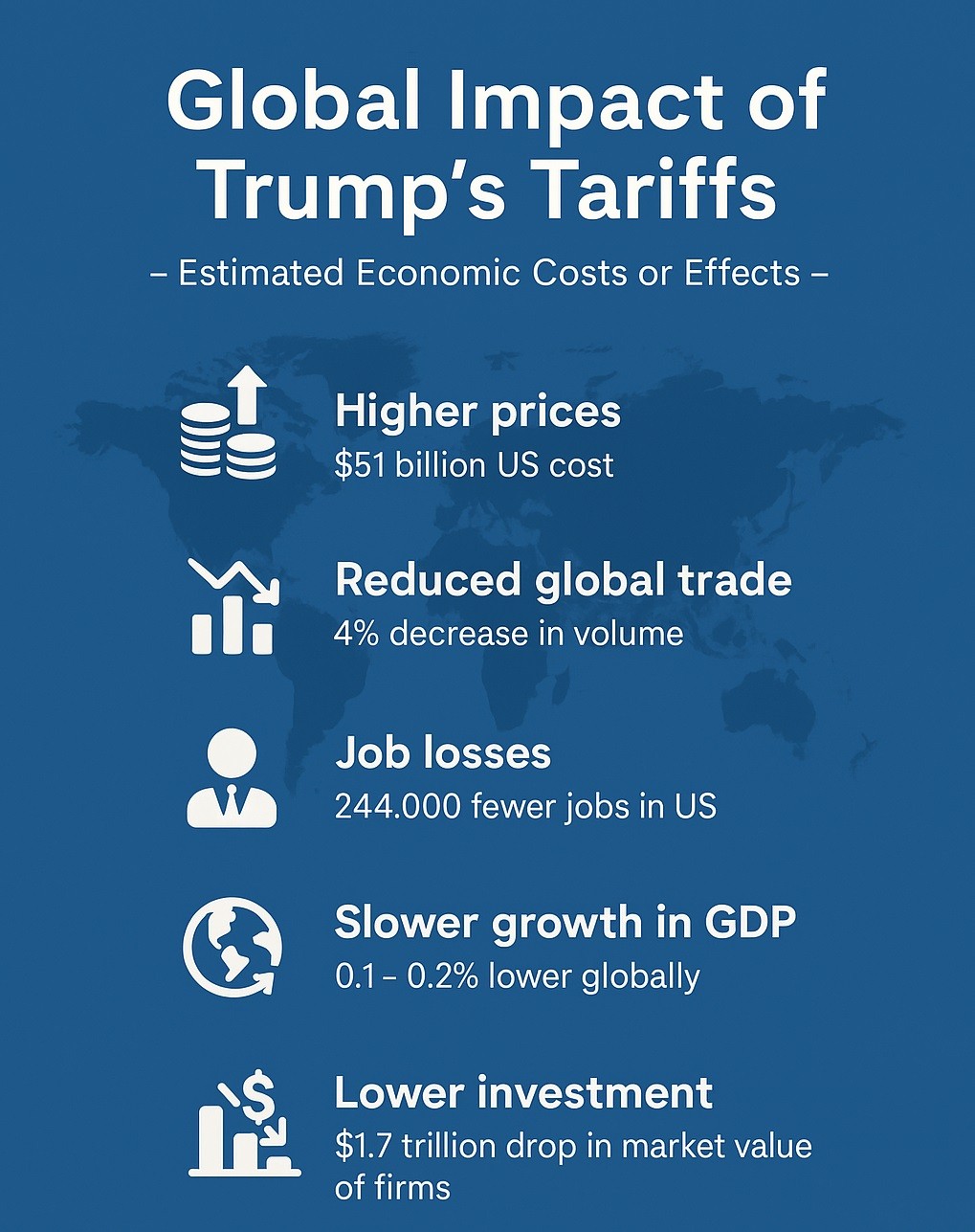 Οι δασμοί αύξησαν το κόστος εισαγωγών για επιχειρήσεις και καταναλωτές. Οι ΗΠΑ, για παράδειγμα, κατέβαλαν εκατοντάδες δισεκατομμύρια σε επιπλέον κόστη για προϊόντα από την Κίνα. Οι τιμές καταναλωτή αυξήθηκαν, χωρίς αυτό να συνοδευτεί από ανάλογη αύξηση των μισθών.