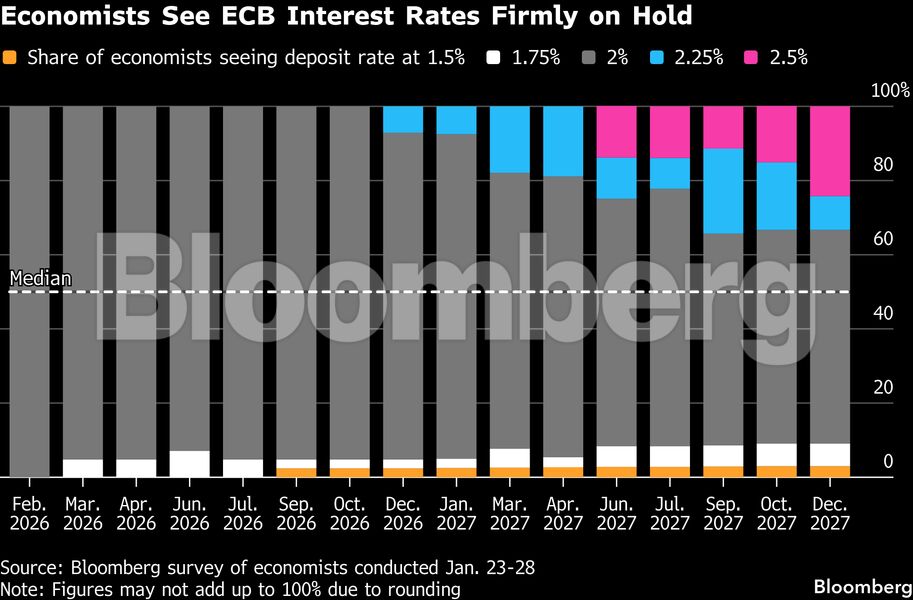 Το επιτόκιο καταθέσεων θα παραμείνει στο 2% την Πέμπτη, σύμφωνα με όλους τους συμμετέχοντες σε έρευνα του Bloomberg. Αναλυτές και αγορές εκτιμούν ότι θα παραμείνει σε αυτό το επίπεδο έως το τέλος του επόμενου έτους, ενώ οι πιθανότητες αύξησης των επιτοκίων το 2026 υποχωρούν.