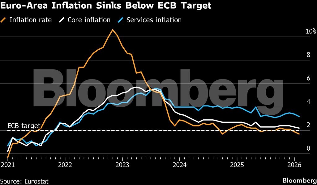 Ο πληθωρισμός στην ευρωζώνη υποχώρησε κάτω από τον στόχο της ΕΚΤ μετά την τελευταία συνεδρίαση, διαμορφούμενος στο 1,7% τον Ιανουάριο. Αν και παραμένει πιο επίμονος, ο δομικός πληθωρισμός παρουσίασε μικρή επιβράδυνση τον περασμένο μήνα, με τις αυξήσεις στις τιμές των υπηρεσιών να μετριάζονται επίσης.
