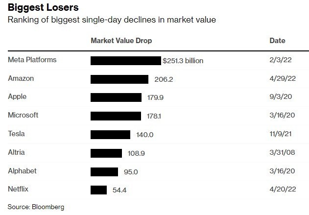 Αποτέλεσμα ήταν η χρηματιστηριακή της αξία να συρρικνωθεί κατά 206,2 δισ. δολάρια. Σύμφωνα με το πρακτορείο Bloomberg, πρόκειται για τη μεγαλύτερη (ever) απώλεια χρημάτων σε μία και μόνο μετοχή, μετά την ελεύθερη πτώση της Meta Platforms (Facebook) τον περασμένο Φεβρουάριο, όταν χάθηκαν 251,3 δισ. δολάρια.