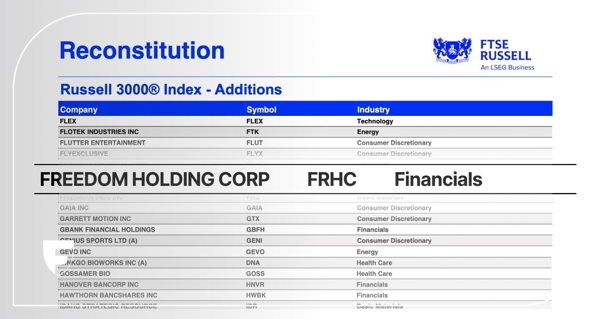 Η Freedom Holding Corp. (FRHC), μητρική εταιρεία της Freedom24, επιλέχθηκε για να ενταχθεί στον δείκτη Russell 3000®, στο πλαίσιο της ετήσιας αναδιάρθρωσης του 2025. Η ένταξη στον δείκτη θα τεθεί σε ισχύ μετά το κλείσιμο της αμερικανικής χρηματιστηριακής αγοράς στις 27 Ιουνίου 2025.