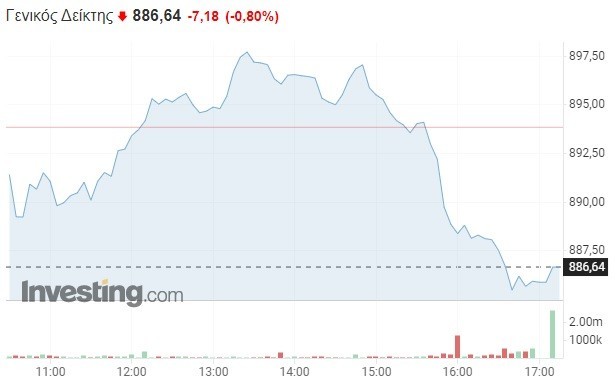 Πιο συγκεκριμένα, ο Γενικός Δείκτης κατέγραψε αξιοσημείωτες απώλειες κατά 0,80% και υποχώρησε στις 886,64 μονάδες, χάνοντας περισσότερες από επτά μονάδες σε σχέση με το κλείσιμο της Τετάρτης (893,82 μονάδες). Το τόξο των ημερήσιων διακυμάνσεων διαμορφώθηκε σε 12 μονάδες (από 885,28 έως 897,91 μονάδες), με τον τζίρο των συναλλαγών να κυμαίνεται σε χαμηλά επίπεδα, μην υπερβαίνοντας τα 59 εκατομμύρια ευρώ (6η ημέρα κάτω των 70 εκατ.).
