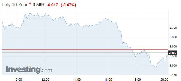 Η απόδοση του ιταλικού ομολόγου εκτοξεύτηκε σε υψηλά 5ετίας στο 3,77% προτού αποκλιμακωθεί κάτω από το 3,48% μετά και τις προσπάθειες του Πιερ Μοσκοβισί να κατευνάσει τα ανήσυχα επενδυτικά πνεύματα, καθησυχάζοντας πως «η κατάσταση θα βελτιωθεί μέσα από το διάλογο».