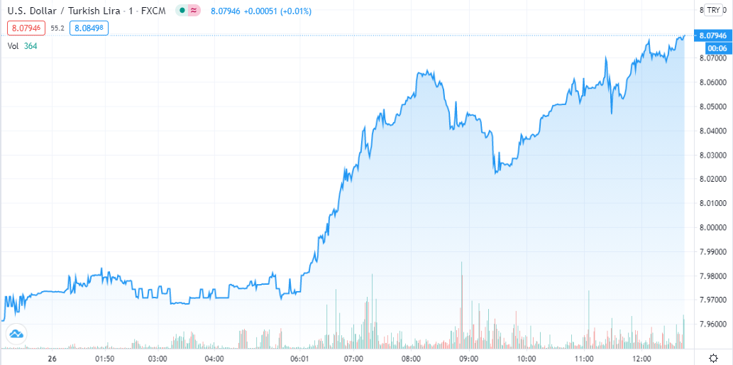 Το τουρκικό νόμισμα υποχωρεί κατά 1,75% από το πρωί, μια τεράστια κίνηση για τις αγορές συναλλάγματος, ενώ από την αρχή του έτους η απώλεια της αξίας της προσεγγίζει το 29%. Νωρίτερα η ισοτιμία υποχώρησε στο 8,0964