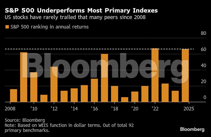 Η ειρωνεία είναι πως ο S&P 500 έχει ενισχυθεί κατά 11% φέτος, καταγράφοντας νέα ιστορικά υψηλά. Ωστόσο, παραμένει πίσω από τους αντίστοιχους δείκτες της Γερμανίας, της Ιαπωνίας, της Νότιας Κορέας, της Ισπανίας αλλά και της Γκάνας — εφόσον οι αποδόσεις υπολογιστούν σε δολάρια.