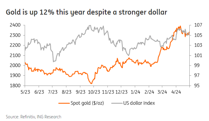 Ο χρυσός έχει σκαρφαλώσει περισσότερο από 12% μέχρι στιγμής φέτος, παρά το γεγονός ότι η Federal Reserve έχει καθυστερήσει το χρονοδιάγραμμα στις μειώσεις των επιτοκίων. Τα υψηλότερα επιτόκια είναι συνήθως αρνητικός παράγοντας για τον χρυσό καθώς δεν αποφέρει τόκους.