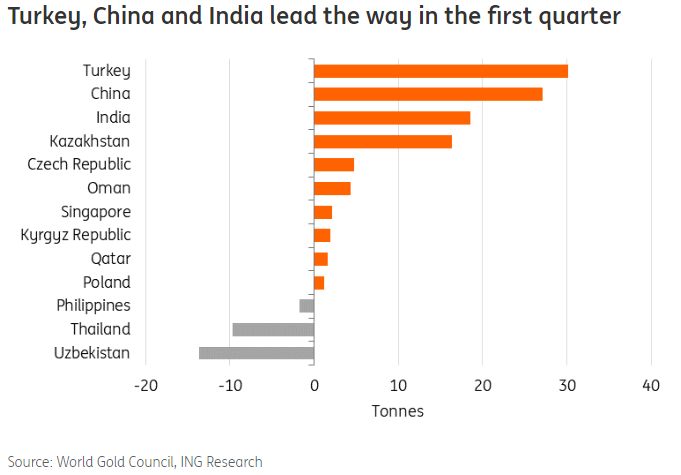 Η ζήτηση χρυσού από τις κεντρικές τράπεζες σημείωσε το ισχυρότερο ξεκίνημά της, σε σχέση με κάθε άλλο χρόνο το πρώτο τρίμηνο. Οι κεντρικές τράπεζες πρόσθεσαν 290 τόνους χρυσού στα επίσημα αποθέματά τους τους πρώτους τρεις μήνες του έτους, με την Κίνα να είναι ο μεγαλύτερος αγοραστής. Η Λαϊκή Τράπεζα της Κίνας πρόσθεσε 27 τόνους στα αποθέματά της σε χρυσό κατά τη διάρκεια του τριμήνου.