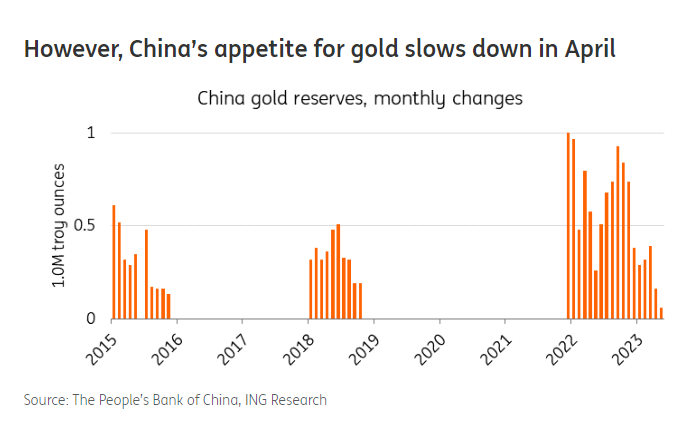 Τον Απρίλιο, η κεντρική τράπεζα της Κίνας επέκτεινε τα αποθέματά της σε χρυσό για 18ο συνεχόμενο μήνα προσθέτοντας 1,87 τόνους και ανεβάζοντας τα συνολικά αποθέματα σε 2264,3 τόνους. Ωστόσο, ο ρυθμός αγοράς επιβραδύνθηκε τον περασμένο μήνα εν μέσω ρεκόρ υψηλών τιμών του χρυσού.