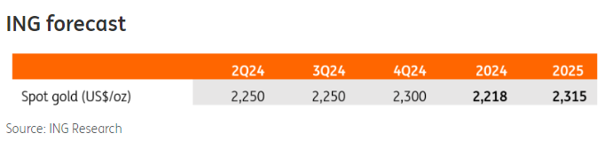 Όσον αφορά τις ακριβείς προβλέψεις της ING σχετικά με την τιμή του χρυσού, αναμένει πως θα μειωθεί ελαφρώς από τα τρέχοντα επίπεδα αυτό το τρίμηνο, καθώς η Fed συνεχίζει την προσεκτική προσέγγισή της, ενώ οι γεωπολιτικές εξελίξεις έχουν ήδη συνυπολογιστεί στην τρέχουσα τιμή. Αναλυτικότερα βλέπει μέση τιμή στα 2.250 δολάρια/ουγγιά το δεύτερο τρίμηνο και ετήσιο μέσο όρο στα 2.218 δολάρια/ουγγιά το 2024.