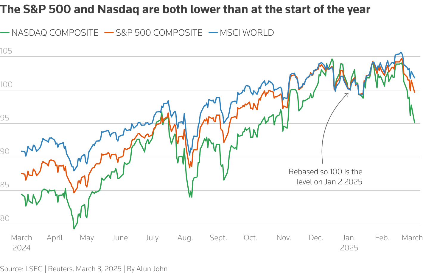 Η Κίνα απάντησε στον διπλασιασμό των δασμών στα κινεζικά προϊόντα στο 20% με πρόσθετους δασμούς 10%-15% σε ορισμένες αμερικανικές εισαγωγές από τις 10 Μαρτίου. Η Ευρώπη βρίσκεται επίσης στη γραμμή του πυρός για υψηλότερους αμερικανικούς δασμούς και οι ευάλωτες στο εμπόριο μετοχές αυτοκινήτων υποχώρησαν κατά 4% μετά τους δασμούς στο Μεξικό και τον Καναδά, όπου κατασκευάζονται πολλά αυτοκίνητα για την αμερικανική αγορά.