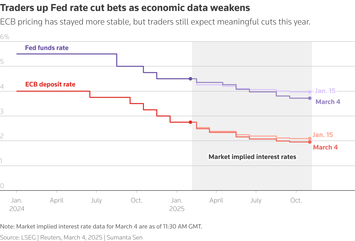 Οι αναλυτές τονίζουν ότι τα πρόσφατα αμερικανικά στοιχεία είναι πιθανό να έχουν στρεβλωθεί από παράγοντες όπως ο κρύος καιρός και οι ισχυρές εισαγωγές στην περίπτωση του μοντέλου της Atlanta Fed. Σημειώνουν όμως επίσης ότι ο εμπορικός πόλεμος σημαίνει ότι η εστίαση μετατοπίζεται γρήγορα από τον πληθωρισμό στους κινδύνους ανάπτυξης από τους δασμούς των ΗΠΑ.