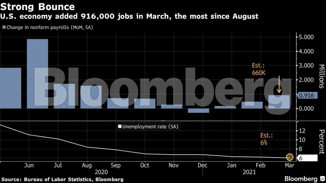 Όπως ανακοίνωσε το υπουργείο Εργασίας, η αμερικανική οικονομία δημιούργησε 916.000 νέες θέσεις εργασίας τον Μάρτιο έναντι 379.000 τον προηγούμενο μήνα. Η συγκεκριμένη επίδοση είναι η καλύτερη των τελευταίων επτά μηνών. Οι αναλυτές προέβλεπαν ότι θα προστεθούν 639.000 θέσεις εργασίας, ενώ το ποσοστό της ανεργίας διολίσθησε στο 6% από 6,2% προηγουμένως.