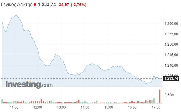 Πιο αναλυτικά, κατά τη σημερινή συνεδρίαση, ο Γενικός Δείκτης σημείωσε ισχυρή πτώση κατά 2,76% και διαμορφώθηκε στις 1.233,74 μονάδες, χάνοντας σχεδόν 35 μονάδες σε σχέση με το κλείσιμο της Παρασκευής. Το τόξο των ημερήσιων διακυμάνσεων καθορίστηκε σε 38 μονάδες (από 1.231,03 έως 1.269,95 μονάδες), με τον τζίρο των συναλλαγών να κυμαίνεται στα 142,7 εκατ. ευρώ.