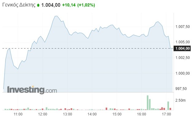 Πιο αναλυτικά, ο Γενικός Δείκτης σημείωσε σημαντική άνοδο κατά 1,02% και διαμορφώθηκε στις 1.004,00 μονάδες, κερδίζοντας τουλάχιστον 10 μονάδες σε σχέση με το κλείσιμο της Τετάρτης (993,86 μονάδες). Το τόξο των ημερήσιων διακυμάνσεων καθορίστηκε σε 12 μονάδες (από 997,47 έως 1.009,33 μονάδες), με τον τζίρο των συναλλαγών να κυμαίνεται στα 72,2 εκατομμύρια ευρώ.