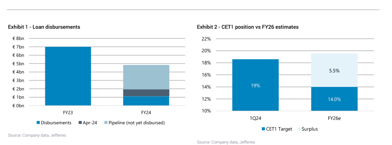 «Εξετάζοντας τις εκταμιεύσεις των δανείων, τα 1,1 δισ. ευρώ στο α’ τρίμηνο φέτος ήταν σε αντιστοιχία με το α’ τρίμηνο πέρυσι, ενώ ο εγκεκριμένος και μη εκταμιευμένος εταιρικός δανεισμός και οι εκταμιεύσεις του Απριλίου είναι ισχυρές. Οι φετινές εκταμιεύσεις και εκείνες που έχουν εγκριθεί (αλλά δεν έχουν ακόμη εκταμιευθεί) ανέρχονται επί του παρόντος σε περίπου 70% του περσινού έτους, γεγονός που είναι θετικό για τον στόχο πιστωτικής επέκτασης του 2024. Η δυναμική του κεφαλαίου συνεχίζεται με τα εποπτικά κεφάλαια CET1 να αυξάνονται κατά 80 μ.β. και πάνω από τις εκτιμήσεις των αναλυτών σε επίπεδα 18,6%. Με στόχο εποπτικού δείκτη CET1 στο 14%, προβλέπουμε 5,5% πλεονάζοντα εποπτικά κεφάλαια στο τέλος του του 2026 ή στο 35% της τρέχουσας κεφαλαιοποίησης της τράπεζας», συμπεραίνει ο οίκος.