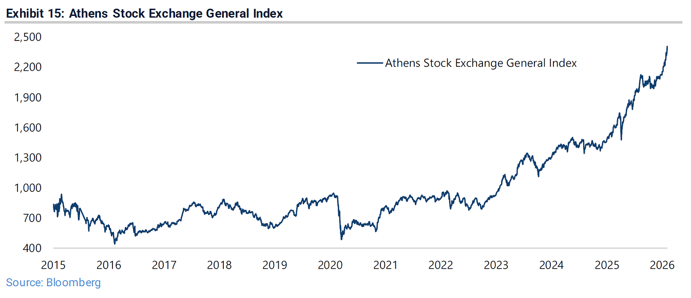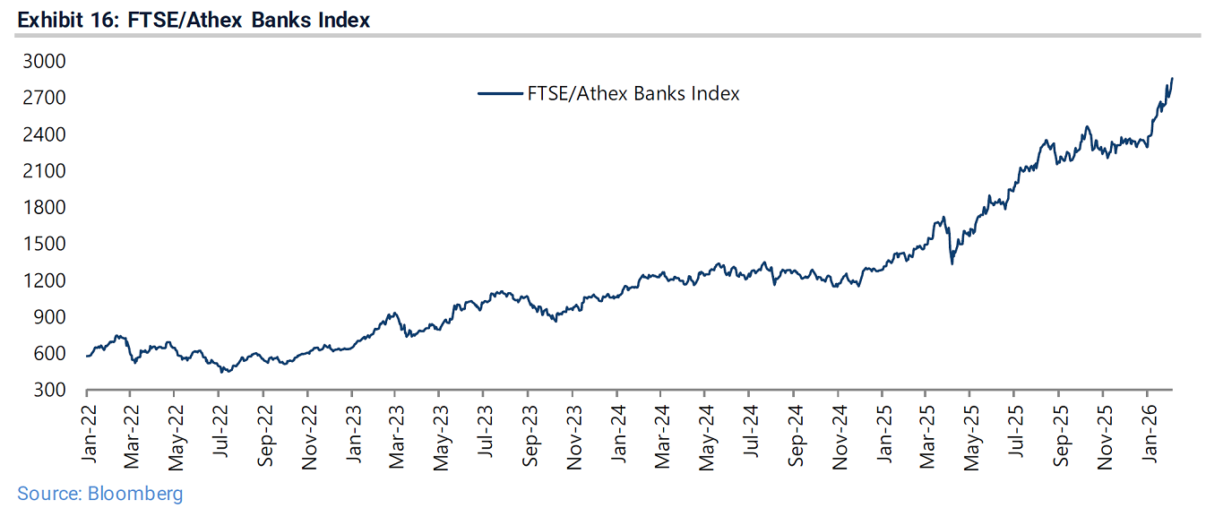 Κεντρικό ρόλο σε αυτή την πορεία έχουν οι τράπεζες. «Οι τέσσερις ελληνικές τράπεζες παραμένουν βασική επενδυτική επιλογή», αναφέρει η Jefferies, υπογραμμίζοντας ότι ο τραπεζικός δείκτης έχει υπερδιπλασιαστεί από το 2025 και συνεχίζει ανοδικά και μέσα στο 2026. Παράλληλα επισημαίνει ότι οι τράπεζες αποτελούν το 77,7% του δείκτη MSCI Greece, κάτι που σημαίνει ότι η πορεία τους καθορίζει σχεδόν πλήρως την αγορά.