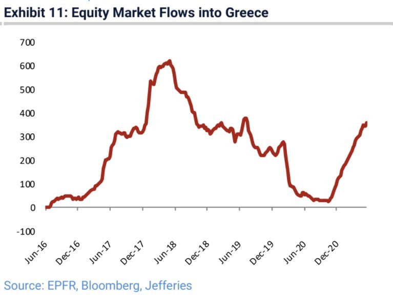 Η αμερικανική Jefferies εξηγεί ότι εγχώριος δείκτης μετοχών έχει δυσκολευτεί να κινηθεί με παρόμοιες αποδόσεις σε σχέση με τις ευρωπαϊκές μετοχές από τις αρχές του χρόνου, αν και απέχει ελάχιστα από τα προ-πανδημικά του επίπεδα, ωστόσο διατηρεί τη θετική της άποψη για την αγορά.